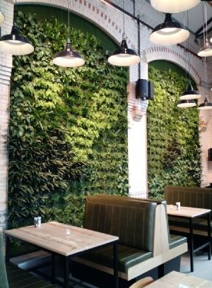 Realisatie van twee verticale binnentuinen van ca. 30 m2 voorzien van verschillende plantensoorten met in totaal ruim 750 planten. Voorzien van automatisch irrigatiesysteem. Verdere bijzonderheden (bijvoorbeeld bijzondere technieken): Dankzij de door MOOOZ ontwikkelde plantenzakken nemen MOOOZ Indoor Green Walls zoals deze bijzonder weinig ruimte in. De totale dikte van de constructie bedraagt nog geen 5 cm. Een automatisch irrigatiesysteem zorgt er voor dat de planten dagelijks water en voedingsstoffen krijgen.
