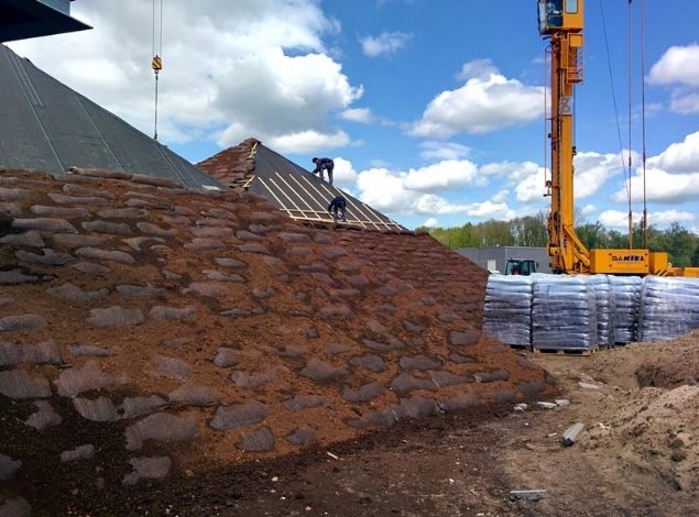 De turfbalen zijn geïmporteerd door Ganzewinkel dakturf uit Limburg. In het vakblad Dak & Gevel Groen stond in enige tijd geleden een artikel over dit systeem.
