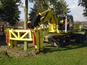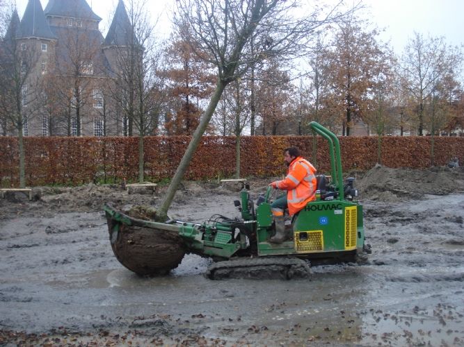Hiervoor hebben we diverse machines zoals de mobile kraan met verplantmachine en de bomenklem met zaag. Daarnaast hebben we ook een kleine machine waarmee we hoofdzakelijk op kwekerijen rooien. Deze bomen graven we in met juten gaas.