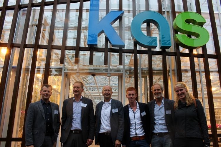 Op de foto, van link naar rechts: Martijn Bekkers (beheerder kas HAS Hogeschool), Toine Hattink (opleidingsdirecteur HAS Hogeschool), Ben van den Brink (docent HAS Hogeschool), Mike Gitzels (student Tuinbouw en akkerbouw HAS Hogeschool) Peter Swinkels (kassenbouwer Technokas) en Lieve Hurkens (student Toegepaste Biologie HAS Hogeschool).