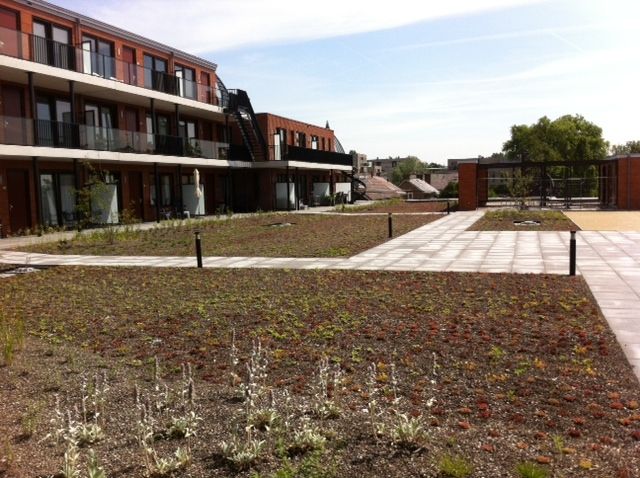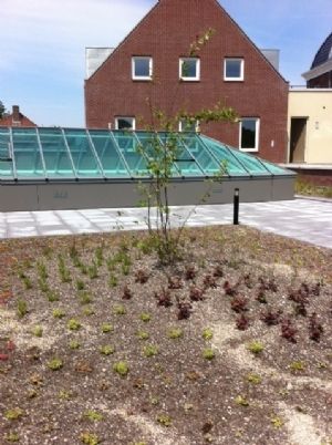 Meervoudig ruimtegebruik in optima forma. Door de aanleg van een Optigroen-daktuin is extra groene leefruimte gecreëerd en wordt de biodiversiteit bevorderd.