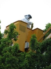 In een tropische hitte staat een medewerker van de gemeente Raalte in de bak van een hoogwerker. Zo’n 10 meter boven het wegdek komen de lokdozen in de kruin van de eiken te hangen. De gevangen mannetjes kunnen straks niet meer aan het bevruchtingsfeest deelnemen. Dat scheelt in zo’n bomenrij straks toch enkele tienduizenden rupsen. De medewerker is goed ingepakt tegen de brandharen. Toch hangt hij de verleidelijke lading toch bij voorkeur in bomen waar weinig rupsen zitten.