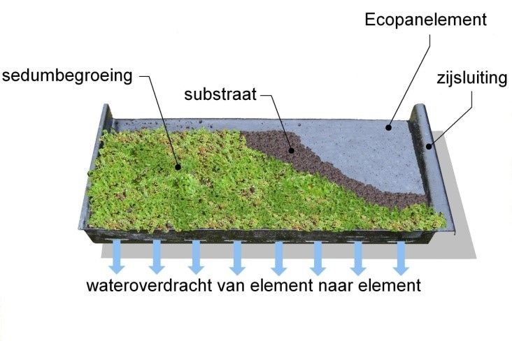 De Ecopan bestaat uit een waterdicht kunststof element waarin een substraatlaag ligt, met daarop een sedumtapijt. Sedums zijn traag groeiend en verliezen geen blad. De plant kan goed tegen zowel vocht als droogte. Het element is qua afmetingen zo ontworpen dat elk dak met sneldakpannen probleemloos kan worden vervangen door de Ecopan, tot een dakhelling van 50 graden.