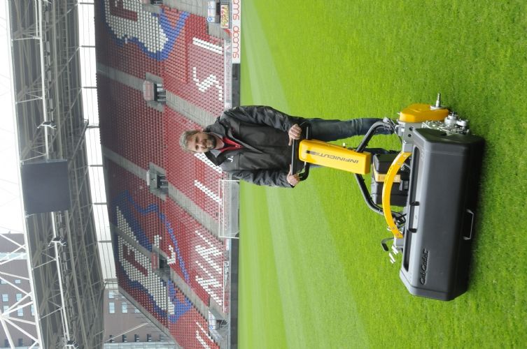 Vooral die laatste optie was voor groundsman Jan Gijzen van FC Utrecht de reden om voor deze maaier te kiezen. ‘Ik ben met onze adviseur Arno Harmsen van Grasmeesters vorig jaar naar Saltex geweest om deze machine te bekijken en was meteen verkocht. Als greenkeeper geloof ik erg in het gebruik van de groomer.’ Wat de machine kostte, wil zowel Gijzen als Tarbox niet zeggen. Tarbox laat het bij een mysterieus: ‘Hij kost wel wat meer dan een Dennis-maaier.’ Gijzen lijkt er in ieder geval heilig van overtuigd te zijn dat de twee maaiers die FC Utrecht gekocht heeft hun geld dubbel en dwars waard zijn. ‘FC Utrecht heeft twee maaiers gekocht, omdat je anders te lang aan het maaien bent. Als je op de dag van de wedstrijd nog wilt maaien en je doet dat met één machine, kost dat al gauw vijf uur. Dan moet je wel heel vroeg beginnen als je twee uur voordat de wedstrijd begint klaar wilt zijn.’