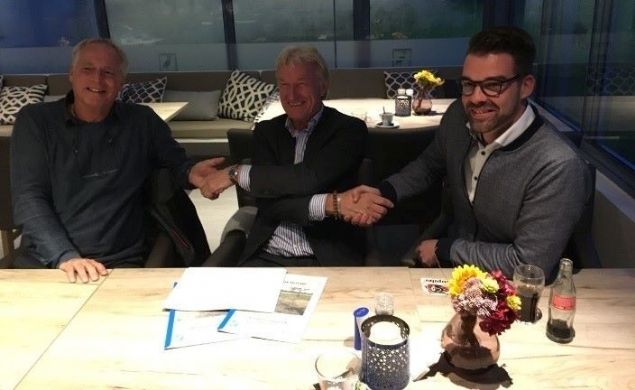 | | Op de foto: Tinus Vernooij namens Golfbaan Delfland geflankeerd door Marc Jansen (L) en Eric Steehouwer (R) van Aha de Man |