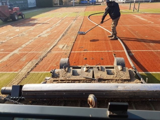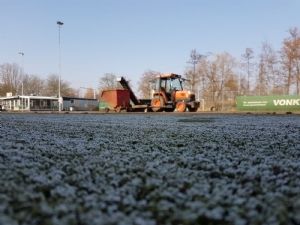 Bastiaan Doornewaard van Silica Nova: 'Voor het weekend hebben we in Zaandam 5400 m2 tennisveld gerevitaliseerd. Dit werd zeker bemoeilijkt door de kou, donderdag moesten we al 4m2 overslaan omdat het in de schaduw lag. Hiervan was gisteren nog geen sprake, toen ontdooide overdag alles gewoon.' Hij vervolgt: 'Het is nu dan ook een race tegen de klok, alles moet af zijn voor het weekend, want anders vriest al het vuil vast in de kunstgrasveld en is revitaliseren niet meer mogelijk.'