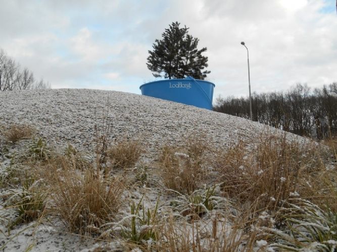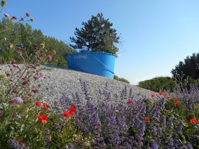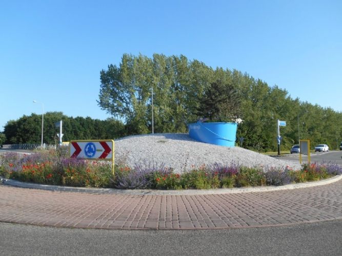 Het ontwerp van de rotonde is gebaseerd op de inspirerende omgeving van de rotonde. Je ziet drie onderdelen terugkomen: het strandgebied in de vorm van de emmer (Loohorst-blauw) en schelpen, de Veluwe en het bosgebied in de vorm van de dennenboom (Pinus) in de emmer, en de lagere graslanden en ontginningen in de rijke beplanting, die een mooie seizoenbeleving biedt. Voor extra kleur is er klaproos ingezaaid.