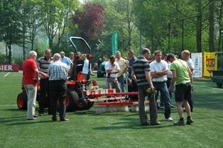Na de lunch ging het praktijkgedeelte van start. Een groot aantal aanbieders van kunstgrasonderhoudsmachines had op zes kunstgrasvelden een selectie van zijn machines geplaatst. Het droge en zonnige weer zorgde ervoor dat de belangstellenden de verscheidene demonstraties enthousiast bijwoonden.