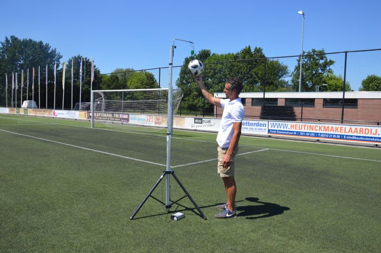 Voordat Van der Zalm met de balrolafstandmetingen begint, kalibreert hij de bal op beton, om te kijken of die wel de goede stuithoogte heeft. Zo kan de bal bij warm weer, zoals vandaag, al gauw te hard zijn, waardoor hij veel hoger stuit. Dat heeft direct invloed op de metingen in het veld. De stuit moet altijd, bij alle weersomstandigheden, voldoen aan de norm van 1,35 meter plus of min 3 centimeter van een hoogte van 2 meter vanaf de onderzijde van de bal. ‘Binnen die marge moet hij zitten; daarna ga je pas meten. Dit geldt voor de balstuit en ook voor de balrol. Hiervoor gebruik ik aparte ballen. Dit is overigens een voorschrift voor de keuring van nieuwe voetbalvelden.’