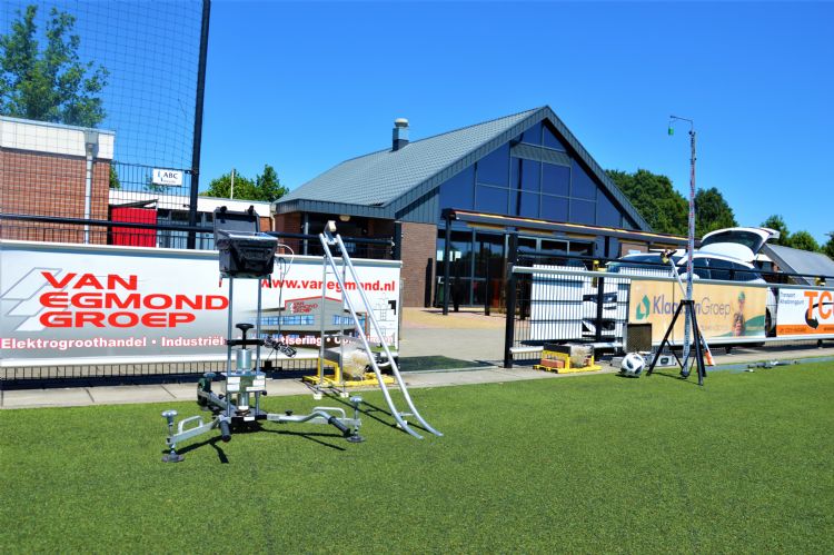 ‘Voor de balroltest wordt een balrolframe gebruikt dat aan bepaalde specificaties moet voldoen, waaronder de hellingshoek, de afstand tussen de rails en de bocht. De bal moet van het frame worden gerold, vanaf het punt waarbij de onderzijde van de bal zich 1.000 m (klopt dit wel?/ KV) ± 5 millimeter ten opzichte van de bovenzijde van de kunstgrastoplaag bevindt. Dan meet je vanaf het punt waar de bal het gras raakt tot het midden van de bal waar hij stopt. Dat doen we in vier windrichtingen. Dat meten we twee keer per windrichting. Aan deze afstand zit een maximum van 15 meter en een minimum van 4 meter.’ Bij een periodieke keuring van velden van acht jaar oud kom je overigens geen balrol van minder dan vier meter tegen. De bal ligt weer stil. Van der Zalm meet de afstand met een laserafstandsmeter en registreert deze in het programma op de tablet. Voetbalvereniging SDOUC heeft weer een zorg minder: het voetbalveld is goedgekeurd zonder herkeuring.