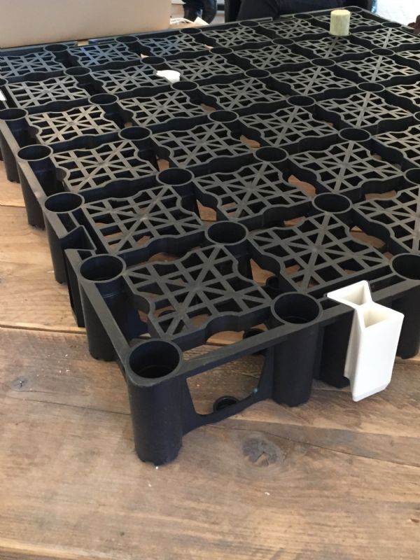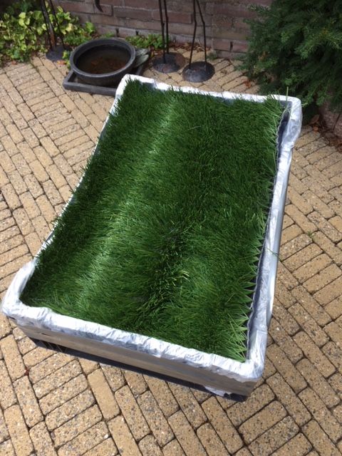 In mijn experiment zijn twee plantkratten waterdicht gemaakt. In deze kratten zijn de zogenaamde boomkratjes geplaatst waarin enkele cones van wateropzuigend 'glaswol' zijn geplaatst. Hierop zijn een drukverdeeldoek en diverse soorten shockpads gelegd. Daarbovenop is speciaal kunstgras neergelegd, ingevuld met zand. Deze combinatie zou vanuit het halfgevulde kratjesreservoir door middel van capillaire werking water naar het kunstgras en infillzand moeten transporteren. Althans, dat was mijn theorie.
