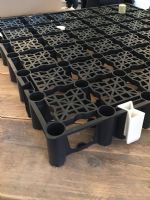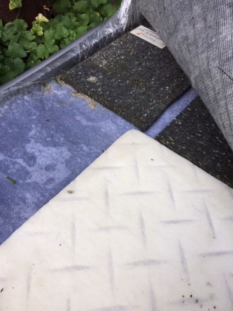 - plantenkratten en inlegplastic - lage (boom)kratjes, cones en drukverdeeldoek (Happy Feets) - Shockpads van Recticel en Progame - Kunstgras 60 mm van CCG zonder latex, goed watertransporterend - Kunstgras van Italgreen met speciale backing (deze liet geen/slecht water van beneden naar boven door) - infillzand GIP 724