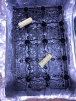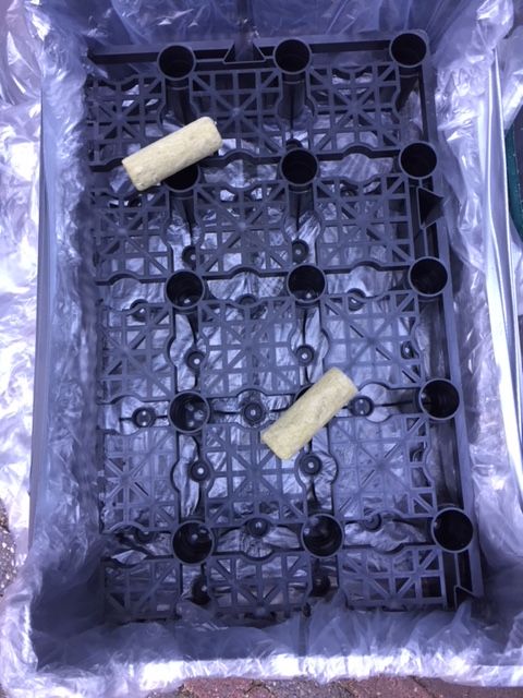 De krat met plastic omhuld, daarin (waterabsorberende) cones