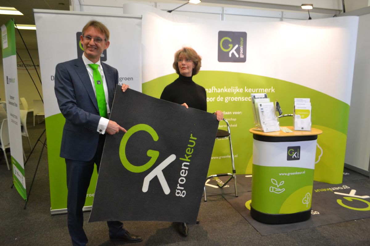 De Groenkeur-tegel, hier vastgehouden door Dick Oosthoek, kwamen we op de beurs veel tegen.