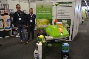 Arjen Spek (Milati) en Gertjan Hilarius (Gazonbemesting.nl) met de Intelligent One.