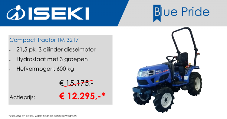 De TM 3217 kan worden uitgerust met een fronthef, frontaftakas en een cabine. Verder kan deze compact tractor worden uitgerust met Iseki tussenasmaaiers, maaiers achteraan, voorlader en alle mogelijke machines voor grondbewerking.