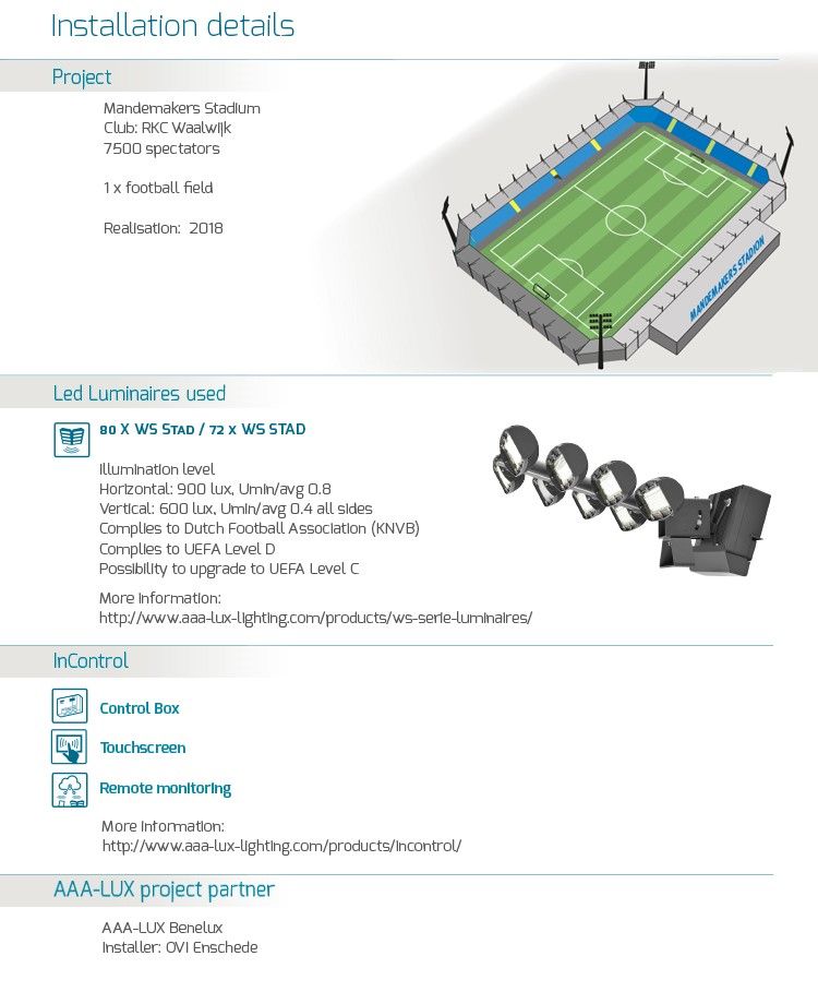 RKC Waalwijk heeft ambities om weer terug te keren naar de Nederlandse Eredivisie. Van Mosselveld: 'Om deze stappen te kunnen zetten moeten de faciliteiten allereerst van topniveau zijn.' De bestaande masten in het stadion konden hergebruikt worden, mits de belasting niet zou toenemen. Daar lag ook direct de uitdaging. 'LED-armaturen zijn doorgaans groter en zwaarder dan conventionele armaturen want voor de overdracht van warmte is er een groter oppervlak nodig. Bij veel LED fabrikanten leidt dit dan ook tot meer massa. Hierdoor wordt het hergebruiken van bestaande masten een lastige opgave', legt AAA-LUX salesmanager Raymond Wiggers uit. 'Dankzij het slimme ontwerp van AAA-LUX zijn wij de enige producent ter wereld die met een all-in product, dus inclusief voeding, in bijna alle gevallen de bestaande masten kunnen hergebruiken', besluit Wiggers.