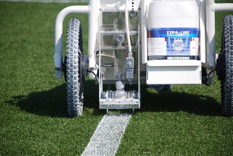 De meeste belijningstoestellen werken met 2 tot 4 bar. Volgens Bogaerts worden de Expoline-lijnen met 40 bar opgespoten. Van Dam: 'Ik merk niet dat het werken met hoge druk het belijnen moeilijker maakt. We belijnen altijd langs een lijntje. Daardoor kun je feitelijk weinig fout doen. We hebben nu een kar met drie wielen; daarmee loop ik even snel als met het vorige karretje met vier wielen. Dat we weleens verder van de lijn af spuiten, komt meestal door kuiltjes in het gras. Maar deze kar ligt goed op het gras en volgt de ondulaties. Het voordeel van de hogedrukspuit is dat je het reservoir ook met water kunt vullen. Dan kun je de kar ermee schoonmaken en doorspuiten. Voorheen gebruikten we aan het einde van de week een reinigingsmiddel om de leidingen van de belijningskar door te spoelen, anders koekte de kalk aan. Het schoonmaakmiddel verdween natuurlijk in het riool. Bij Expoline hoeven we geen schoonmaakmiddelen te gebruiken. Aan de spuitkop van de Expoline-kar zit een knopje dat je kunt omdraaien; dan blaast de hoge druk het vuiltje in de spuitkop weg uit de leiding. Daarna draai je het knopje terug en kun je weer verder met belijnen.'