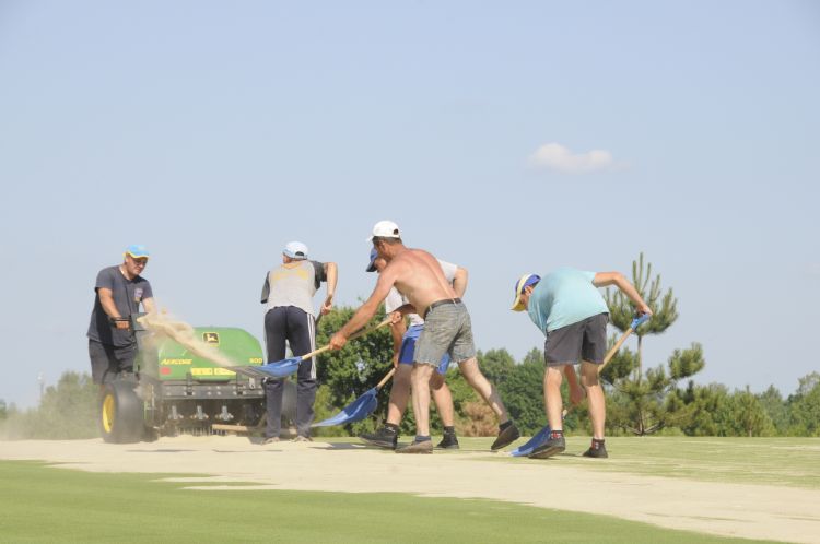 De temperatuur is al die hele dag ruim boven de dertig graden en ook al hoeven we zelf niet te werken, zulk weer put je uit. De Oekraïense greenkeepers lijken daar minder last van te hebben dan de koele kaaskoppen uit Nederland. Dat is tenminste het eerste wat ons opvalt als we het terrein van de tweede golfbaan op rijden. Een team van zeven man is, hevig zwetend en in de volle zon bij meer dan 30 graden, een green aan het bezanden en beluchten. Eerst wordt voorgedroogd zand met de bats zo mooi mogelijk verspreid over de toplaag; daarna worden de greens belucht met een John Deere-walkbehind-beluchter, voorzien van solid tines. Tegelijk wordt met een rubber vloertrekker zand in de tien millimeter dikke gaten geveegd en getrokken. Het resultaat is dat er met veel hard werken en nog meer zweet drie tot vier greens per dag worden aangepakt. Voor Nederland is dit geen te kopiëren methode; het kost eenvoudig te veel arbeid. Van der Woude gelooft daarnaast niet in voorgedroogd zand. 'Te duur', is zijn mening. Alle bodemleven is totaal doodgemaakt, en voor de rest geldt natuurlijk dat het drogen van de dressgrond een kwestie van minuten is wanneer je onder goede omstandigheden belucht.