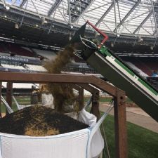 Het bedrijf had daarmee te maken met een krappe deadline: de werkzaamheden moesten binnen 48 uur worden gerealiseerd. 'Daarom hebben wij KSP ingehuurd ter ondersteuning', aldus Doornewaard. 'Wij hebben ongeveer 500 ton infill uit de mat geklopt. In 14 draaiuren is dit allemaal gerealiseerd.'