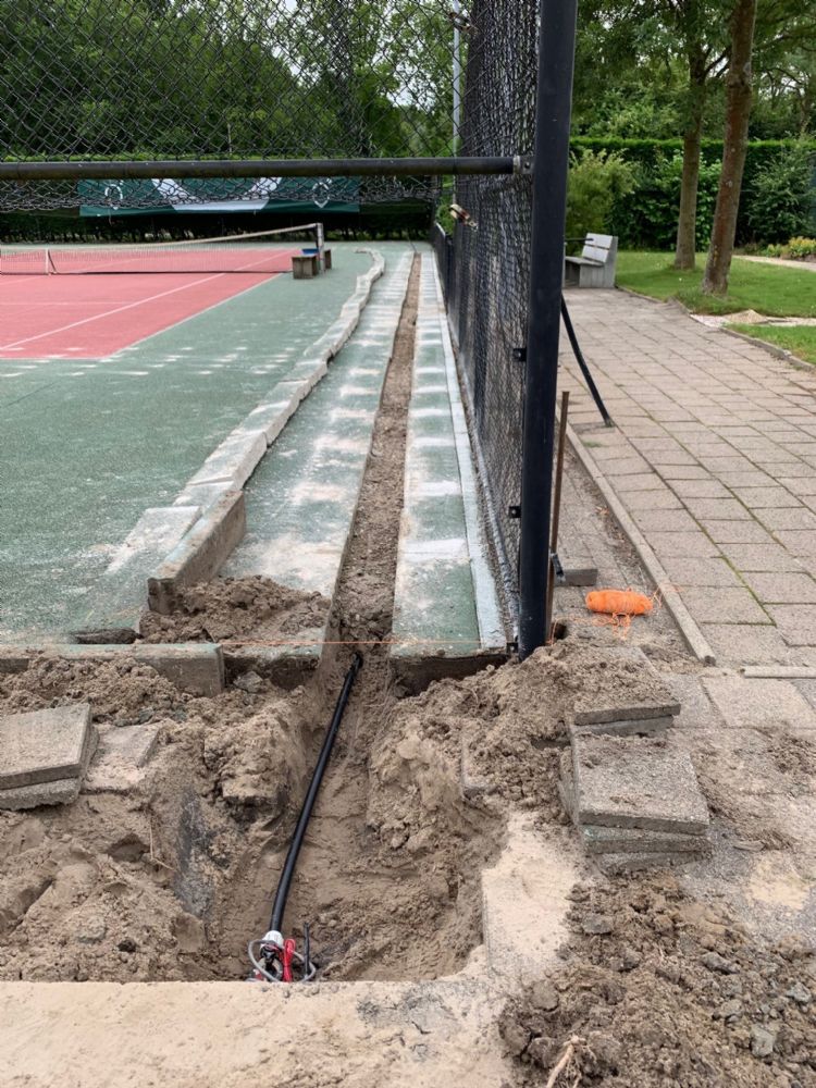 De banen worden tevens voorzien van automatische beregening, aangelegd door Van Oosten Beregeningssystemen. Daar zit veel voorbereidend werk in, vertelt Mathieu de Rooij van Ton de Rooij Tennis. 'Eerst is er gezaagd in de ondergrond om ruimte te maken voor de leidingen. De banen zijn daarna dichtgemaakt, geëgaliseerd en pas daarna kan de toplaag erop. Alles bij elkaar neemt het werk op locatie ongeveer zes weken tijd in beslag.'