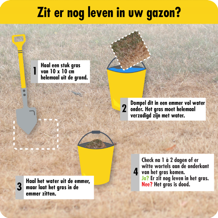 Vitaliteitstest (zoals uitgelegd op de foto)1. Steek met de schep een stuk gras uit de grond.2. Leg dit in een emmer water, totdat de graspol volledig verzadigd is. 3. Laat het water uit de emmer lopen en laat de graspol erin liggen. 4. Als er aan de onderkant van de pol na twee tot drie dagen witte worteltjes ontstaan, leven de grasplanten nog. Conclusie stap 1: witte of bruine worteltjes?Grasplanten die witte worteltjes vormen, kunnen herstellen indien er vocht beschikbaar komt. Als er geen nieuwe witte worteltjes tussen de bruine wortels ontstaan, is de kans klein dat de grasplant de hitte en droogte heeft overleefd.Let op: gevaar!Doordat de bestaande grasplanten heel zwak of dood zijn, is er veel plaats voor nieuwe planten. Dit kunnen ook ongewenste planten zijn, zoals straatgras of onkruid. Van deze planten zitten waarschijnlijk nog veel zaden in de grond, die gaan kiemen als er vocht beschikbaar wordt gemaakt. Als de grasmat niet wordt geholpen bij het herstel, krijgen deze planten de overhand en ontstaat er een lelijke en zwakke grasmat.Stap 2: Doe de waterafstotendheidstestEen goede vitaliteit is geen garantie dat de grasmat ook herstelt; het is essentieel dat de bodem water opneemt. Is de grond waterafstotend, dan zal de grasmat niet herstellen, zelfs als hij water krijgt. Waterafstotende grond ontstaat door stress in de grasplanten, in andere planten en in bodemorganismen gedurende hete en droge perioden. Water kan daardoor niet meer of soms slechts lokaal de bodem in trekken. Waterafstotende grond maakt het voor de verdroogde grasplant dus nóg lastiger om te herstellen als er wel weer regen valt, want het regenwater bereikt de wortels niet. De waterafstotendheid moet dus eerst worden opgelost.DruppeltestDe volgende test laat goed zien of grond waterafstotend is.1. Steek met een schep of guts een plug gras uit. 2. Leg op elke 2 cm diepte een druppel water. 3. Duurt het meer dan één minuut voordat de druppel in de grond trekt, dan is de grond té waterafstotend voor normaal herstel van de grasmat. Doorzaaien met gewoon graszaad zal geen effect hebben. Conclusie stap 2: waterafstotend of niet?Als de bodem waterafstotend is, heeft doorzaaien met een normaal graszaadmengsel geen zin. Water kan het zaad niet bereiken voor kieming en eventuele gekiemde zaden kunnen geen plant worden als het water de wortels niet kan bereiken. Barenbrug heeft een oplossing voor waterafstotende bodems: Yellow Jacket Water Manager. Door de revolutionaire zaadbehandeling met Yellow Jacket Water Manager wordt de waterafstotendheid tenietgedaan; die komt ook niet terug gedurende de periode dat de jonge grasplanten uitgroeien tot volwassen planten (de vestigingsperiode). De grasmat wordt weer sterk en vitaal, met gezonde sterke jonge planten.Herstel droogteschade in gazonsMet dit stappenplan creëer je in no time weer een gezonde vitale grasmat.1. Zorg dat alle dode grasplanten en eventueel vilt worden verwijderd door het verticuteren van de grasmat en het opruimen van dit dode materiaal. 2. Prik kleine gaatjes in de grond om lucht en water in de grond te krijgen. 3. Kies het juiste grasmengsel om te zaaien. Er zijn veel grasmengsels beschikbaar voor gazons. Voor elke situatie is een andere oplossing optimaal, maar niet alle grasmengsels zijn geschikt voor snel herstel van een grasmat. Bovendien ligt het gevaar van onkruid op de loer. Er zitten veel onkruidzaden in de grond die nu razendsnel de kale plekken opvullen. Ook straatgras neemt snel de vrijgekomen ruimte in beslag en zorgt voor een zwakke grasmat. Het is essentieel om nu een snel kiemend en vestigend graszaadmengsel te gebruiken, om concurrentie te kunnen bieden tegen deze ongewenste invasie. Het Bar Power RPR-mengsel is het breedst inzetbaar én zorgt razendsnel voor een mooie dichte grasmat. 4. Zaai de grasmat door met Bar Power RPR, zodat er weer een nieuwe sterke grasmat ontstaat met gewenste grassen.