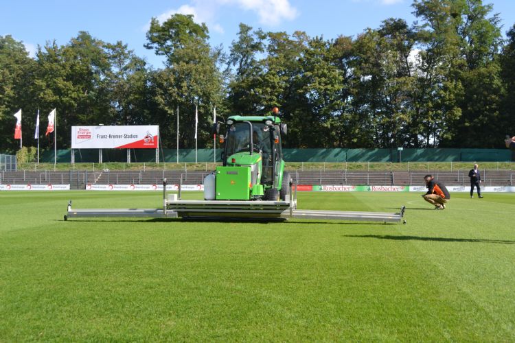Tijdens ons bezoek aan het trainingscomplex van FC Köln bekijken we twee velden. Het eerste veld dat we zien is het hoofdveld van het Franz-Kremer-Stadion, waar het tweede elftal van de club speelt, het vrouwenelftal en diverse jeugdelftallen. Het veld, een hybrideveld van Heiler, is net gemaaid. Vanwege een bekerwedstrijd is de behandeling met de lichtpanelen hier vijf weken later begonnen dan gepland. Dat is nog te zien; de grasmat is niet helemaal dichtgegroeid. Op de dag van ons bezoek is de behandeling met licht eigenlijk pas net begonnen. Het levert onder de bezoekers nog wat sceptische reacties op.