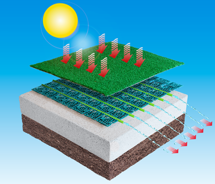 Eerder dit jaar hebben we in Fieldmanager (editie 2) de SubTile van SuperSub SportSystems al uitgebreid uitgelicht. SubTiles zijn tegels van 75 x 75 mm die samen de onderbouw van een kunstgrasveld vormen. De tegels zijn geschikt voor zowel kunstgrashockey- als -voetbalvelden. Het Collectorveld is een aanvulling op de SubTiles. Bij een Collectorveld worden slangen (SubTubes) in de onderbouw van tegels gemonteerd, zoals te zien op de afbeelding bij dit artikel. Door de slangen loopt water (of een andere vloeistof), dat door de hitte verwarmd wordt en die warmte afgeeft aan een warmtepomp. Door de laag schuimbeton onder de tegels, die isolerend werkt, blijft de warmte behouden. De vrijgekomen stralingsenergie kan overgebracht worden naar een warmtewisselaar of naar een opslag in de grond, waardoor je met kunstgras dus op een alternatieve manier energie opwekt.