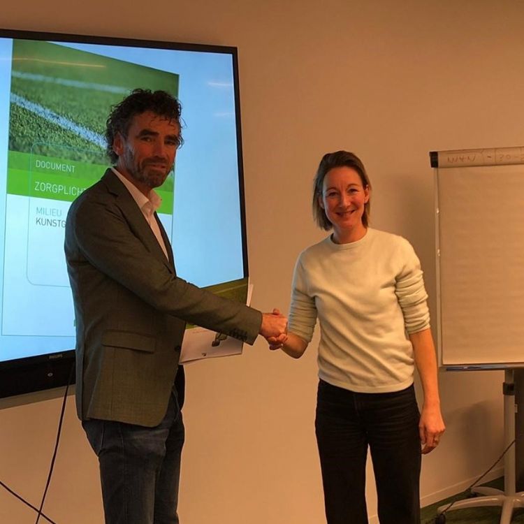 Donderdag 14 november heeft BSNC-voorzitter Edward van der Geest het nieuwe zorgplichtdocument aangeboden aan Joëlle Staps, plaatsvervangend directeur sport van VWS. De overhandiging vond plaats op het door VWS georganiseerde overleg kunstgrasrecycling in Utrecht.