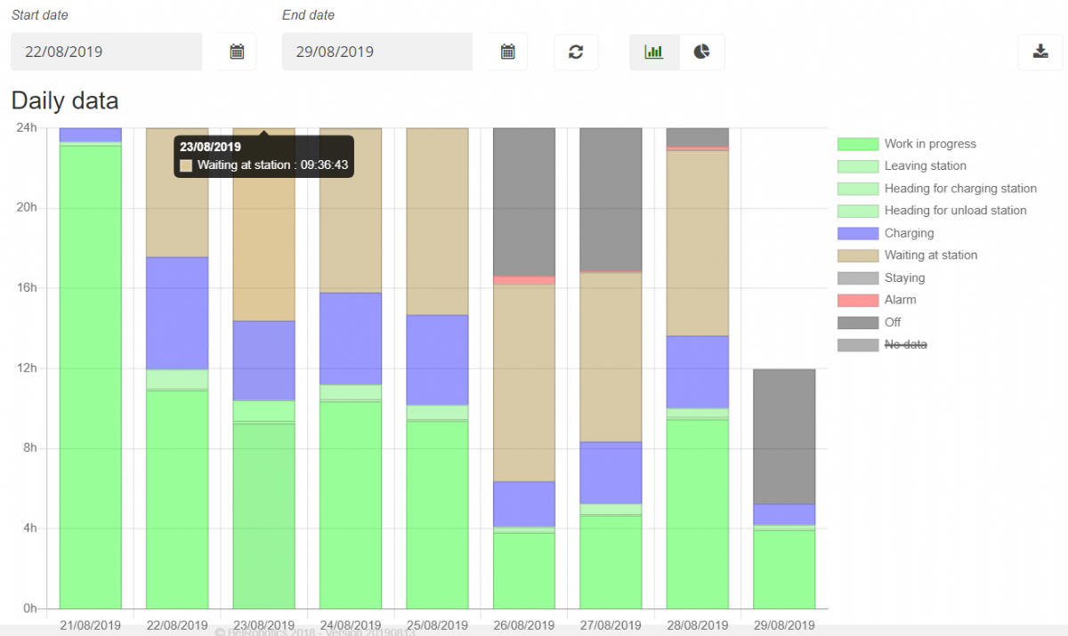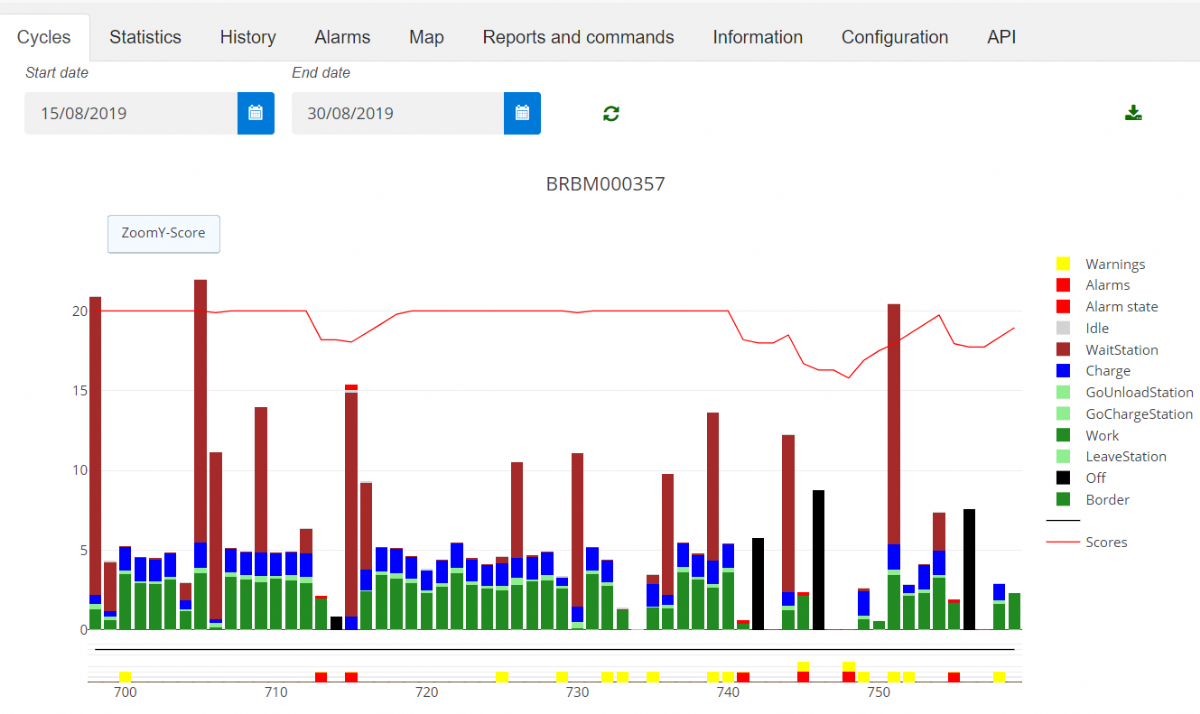 De maairobots die voor Verweijen het werk doen, zijn afkomstig van het eerdergenoemde Belgische bedrijf Belrobotics. Naast enkele oudere modellen bevat het robotpark van Ataro sinds de zomer van 2018 enkele robots uit de Connected Line van Belrobotics, om precies te zijn de Connected Line BigMow. 'De robots werken met een magnetisch perimeterdraad rondom het veld waarbinnen zij blijven. De aansturing verloopt geheel via de app. De trainingstijden en wedstrijden programmeer ik van tevoren in, zodat de robot dan in de oplader zit. Op de app kun je precies zien hoelang hij heeft gemaaid en hoeveel hij is opgeladen, maar bijvoorbeeld ook wanneer er een storing heeft plaatsgevonden.' Elke robotmaaier is een entiteit binnen de app, dus de fieldmanager heeft het volledige overzicht over al zijn Connected Line-maaiers binnen handbereik.