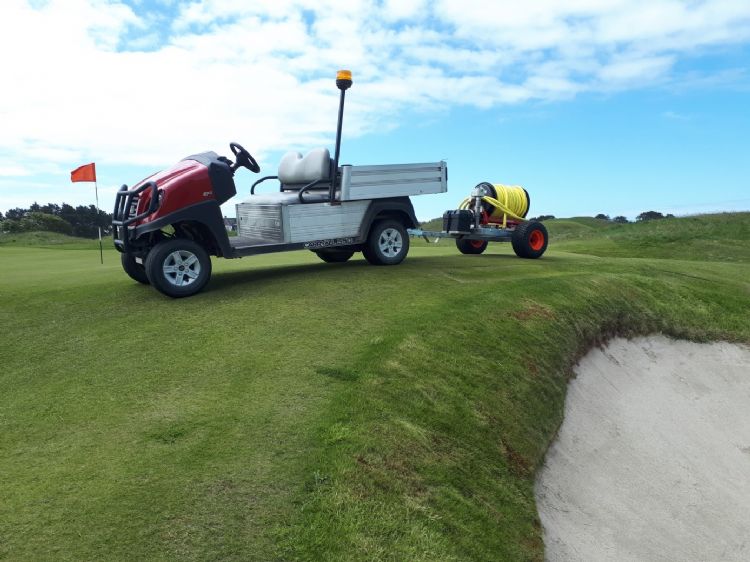 Om uw natuurgras handmatig met meer precisie te beregen, heeft Smits BV de elektrische towable hose reel trailer ontwikkeld. Het ergonomische ontwerp en de robuuste constructie maken het bedienen van de slang eenvoudiger, sneller en efficiënter. De machine is gemakkelijk te bevestigen aan de meeste offroad-golfkarren of ATV met trekhaakpen. De zware stalen 12 V elektrisch aangedreven haspel kan zware lasten aan. Dankzij de extra lange aanhangwagendissel kunnen scherpere bochten worden genomen en kan eenvoudiger achteruit worden gemanoeuvreerd. Hij is tevens voorzien van grasbanden (alleen voor offroad-gebruik) en wielen van hoge kwaliteit. Mocht u interesse hebben, neem dan contact op met Smits of bezoek het bedrijf in stand 2.3.27.
