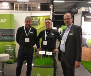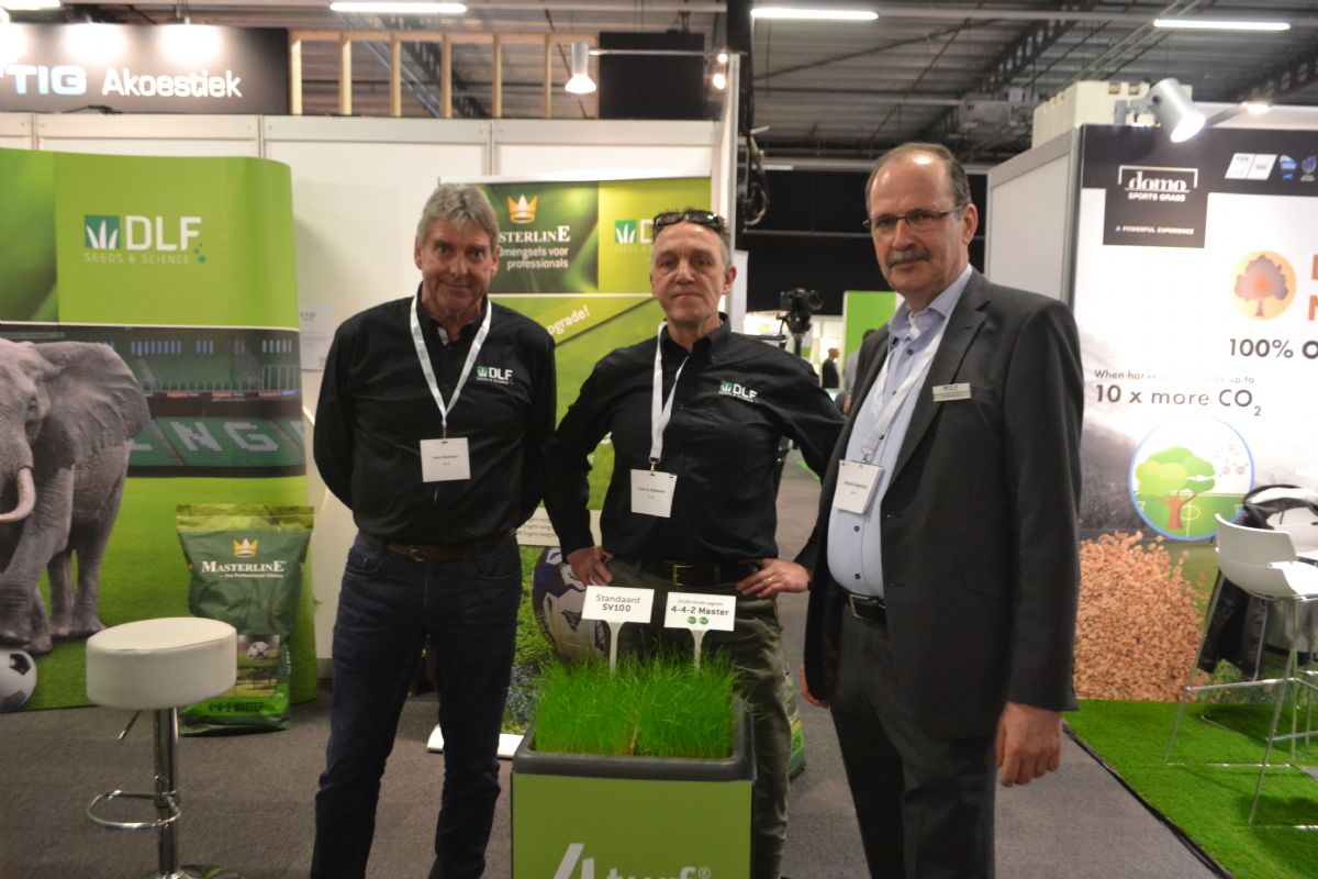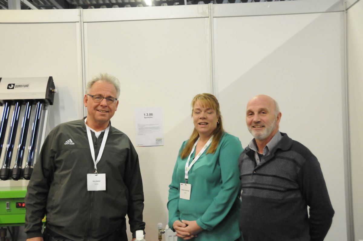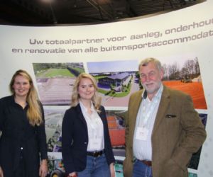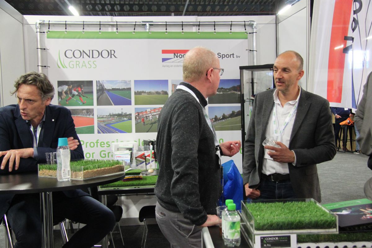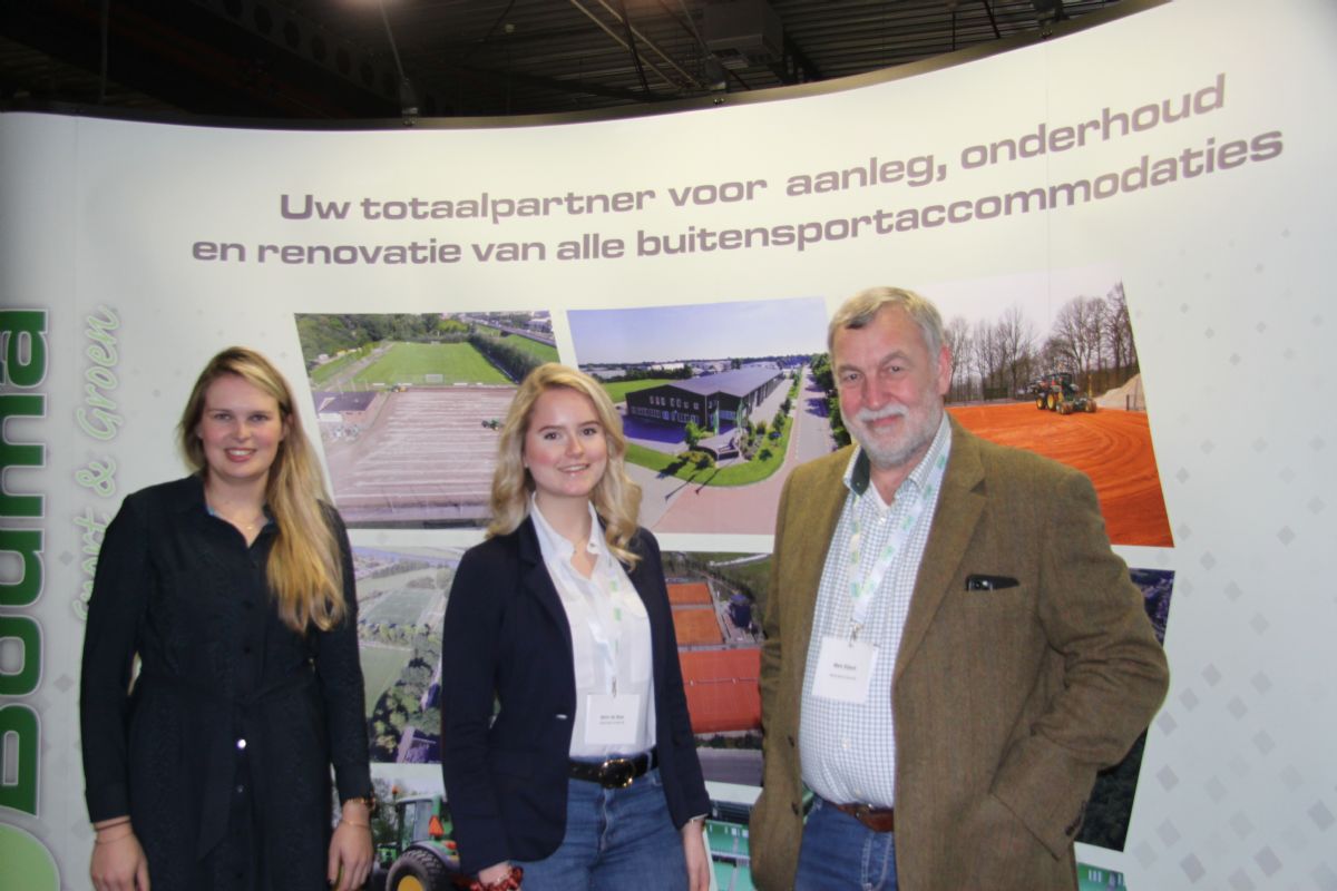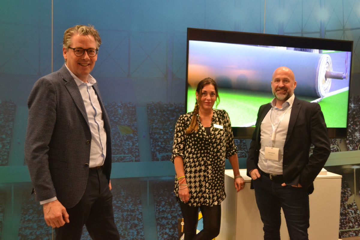 Gosewin Bos, Nathalie Janmaat en Frank Herbrink (Edel Grass) op de stand van Antea Sport.
