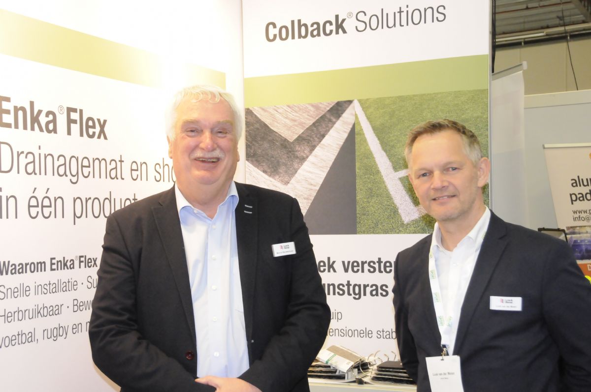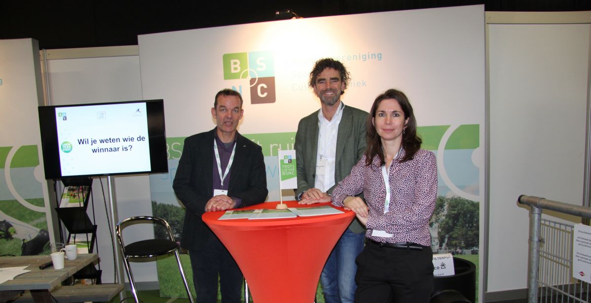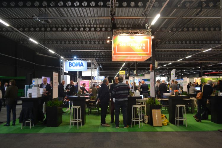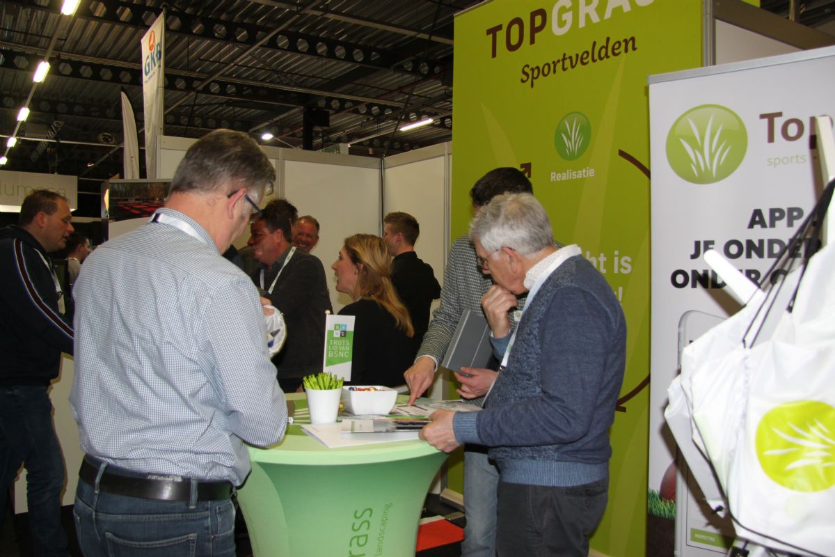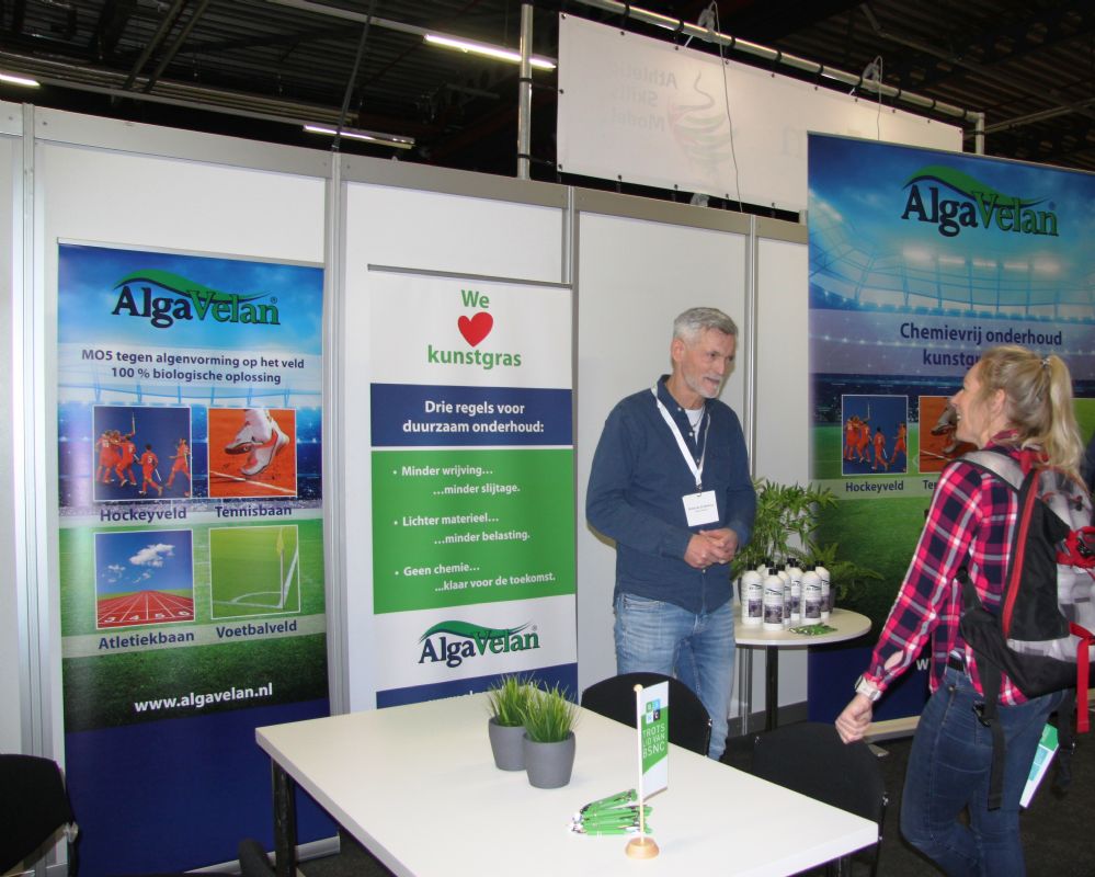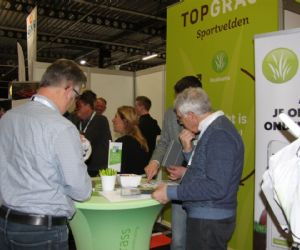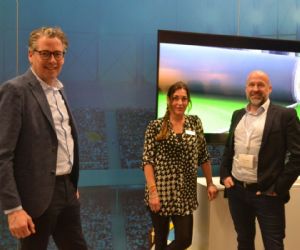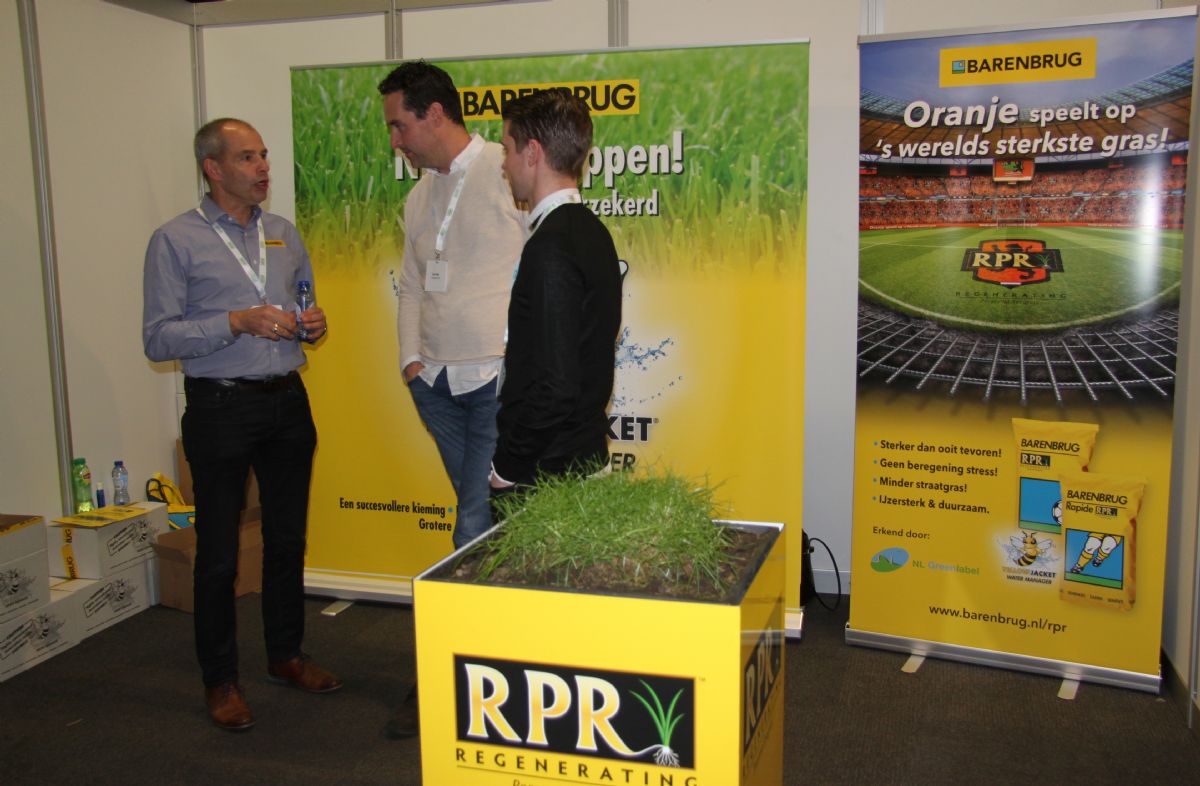 Gosewin Bos, Nathalie Janmaat en Frank Herbrink (Edel Grass) op de stand van Antea Sport.