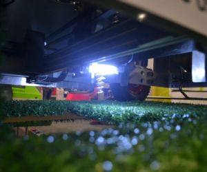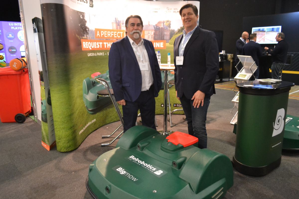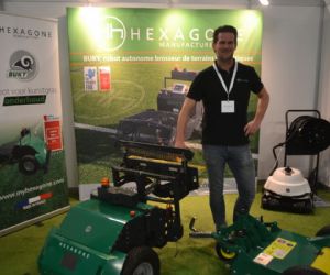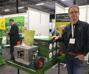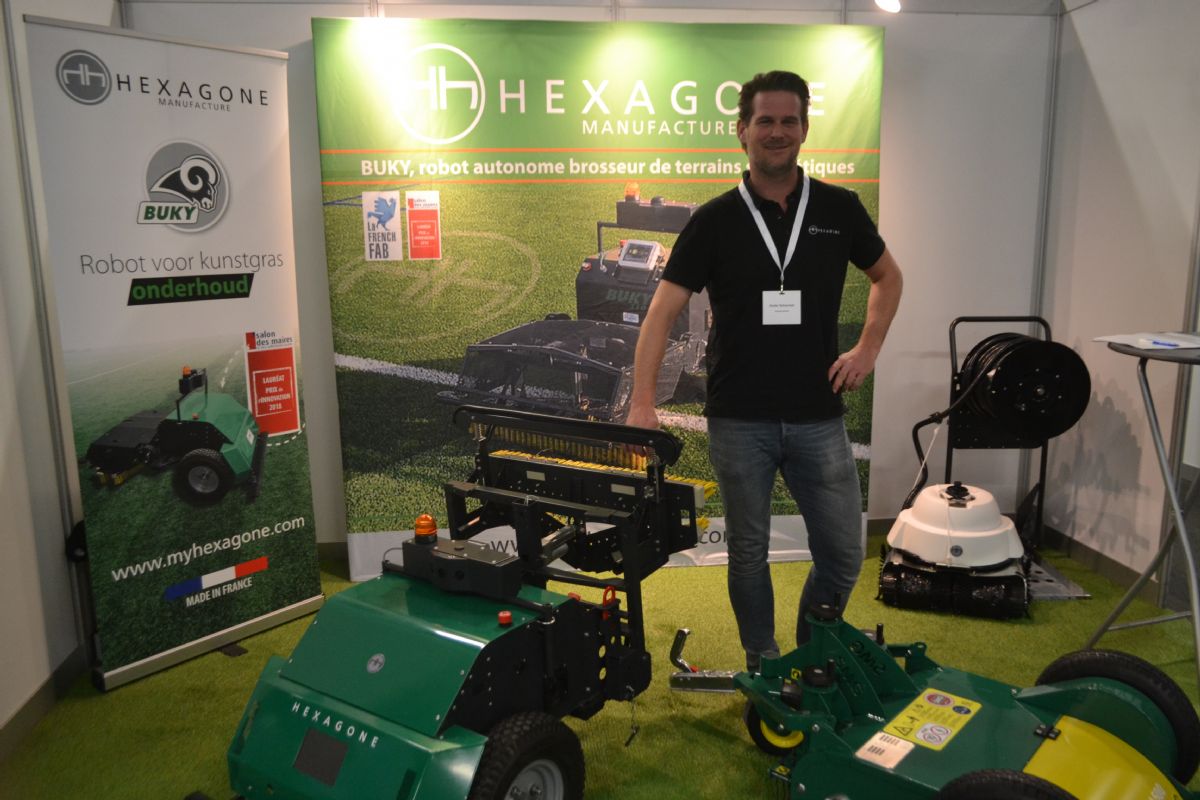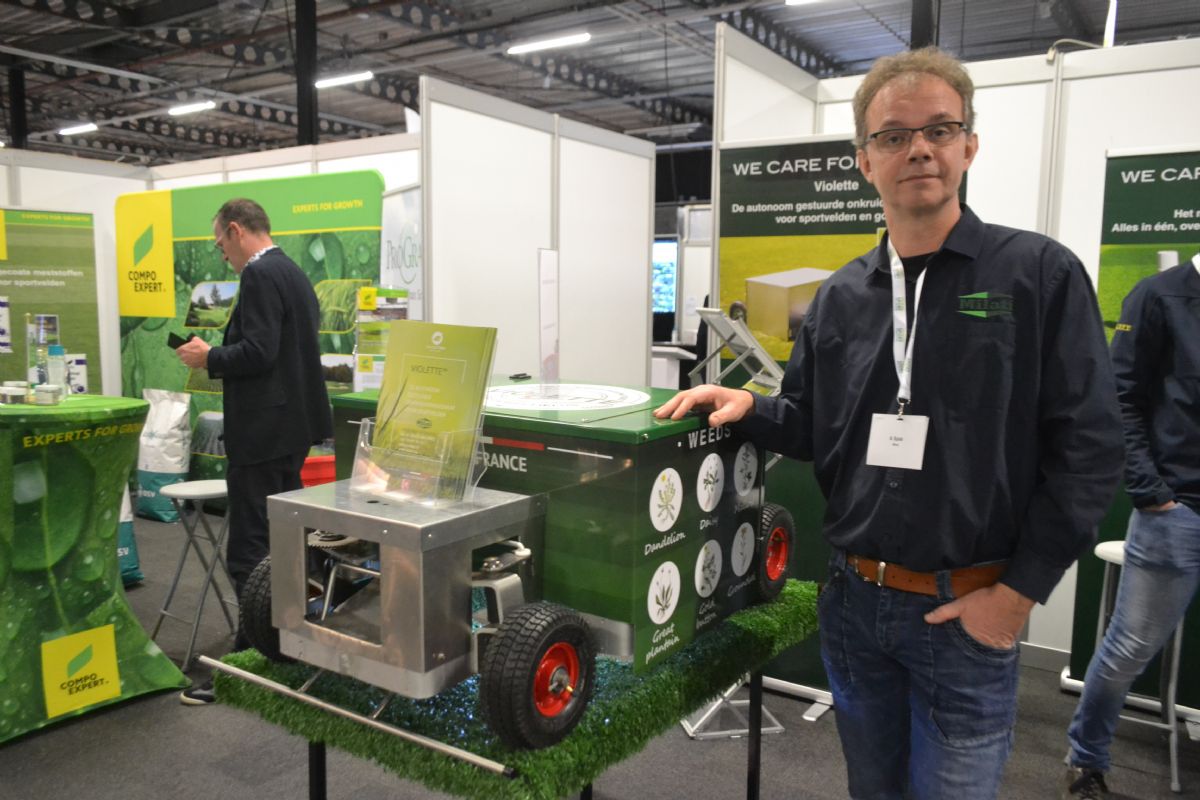 Sander Schuurman (Hexagone) met de Buky onderhoudsrobot voor kunstgrasvelden.