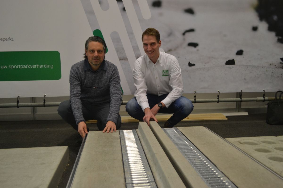 Jan Willem Boon en Rob Klumpers (Sim Beton) met hun nieuwe goot in beton voor langs een kunstgrasveld.