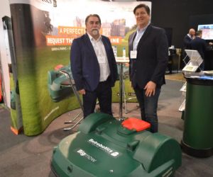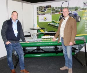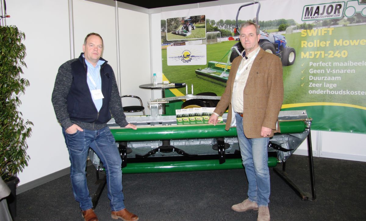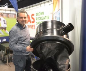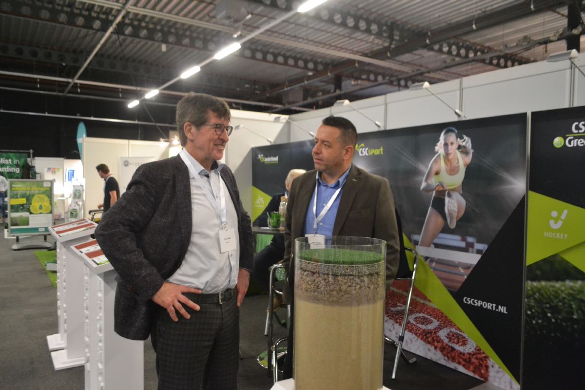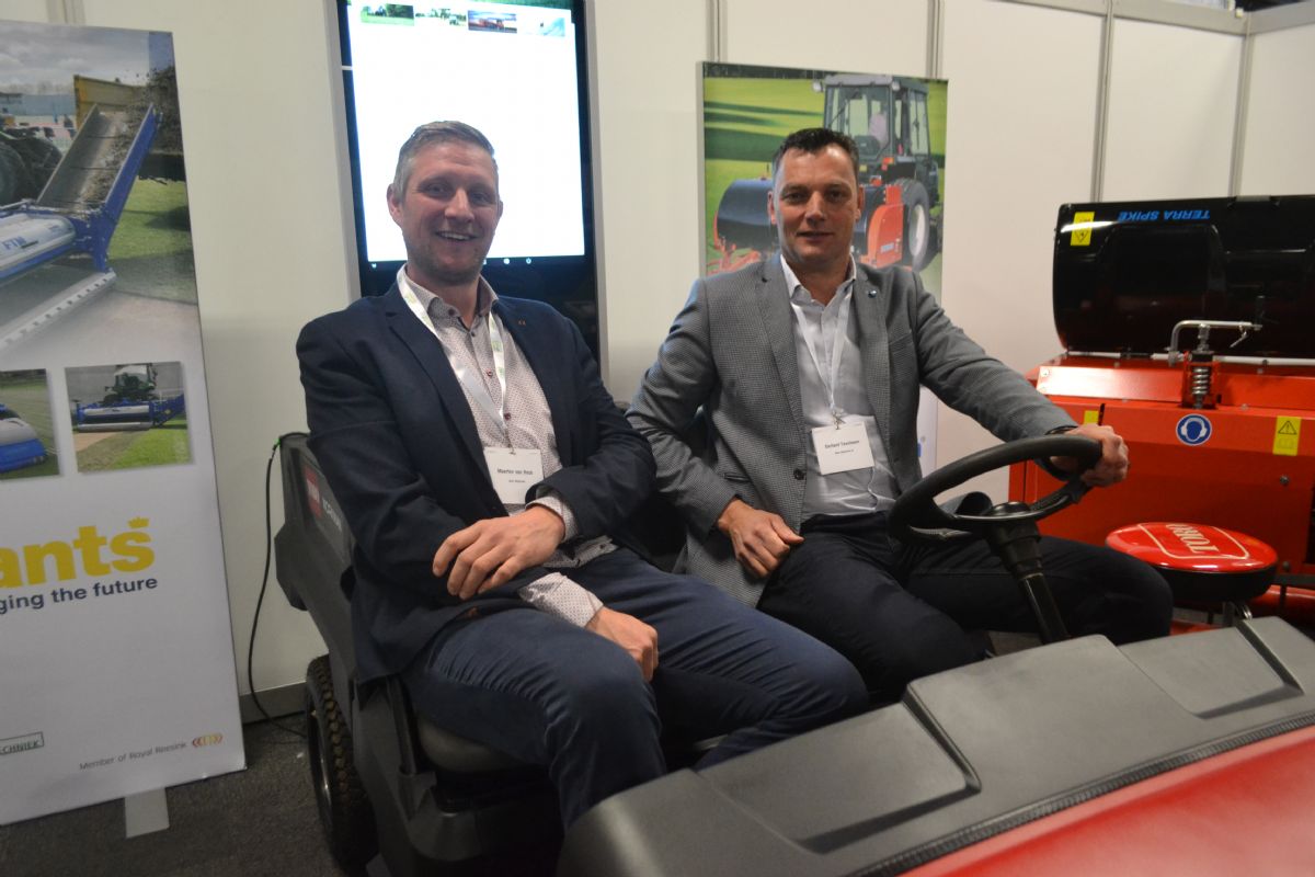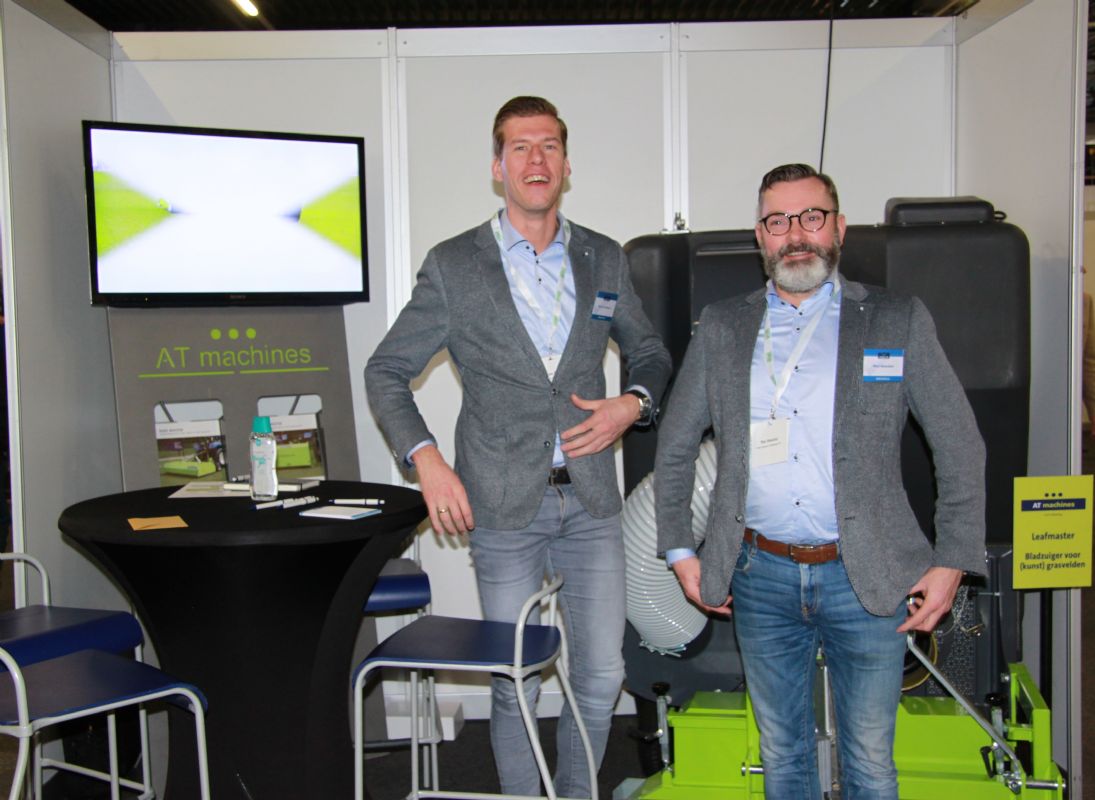 Teus van Ekeren en Paul Steenkist van Voets Machines showden bezoekers hun pakket aan kunstgrasreinigers