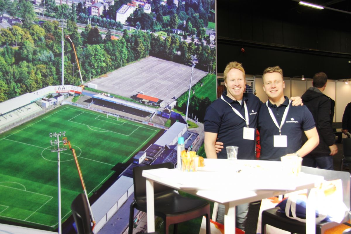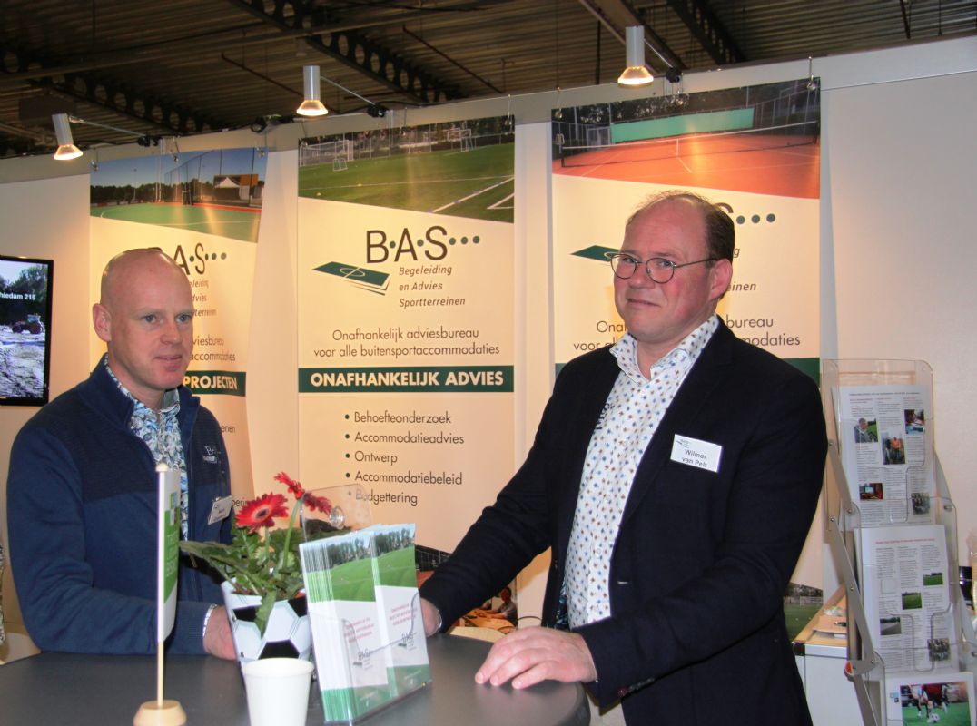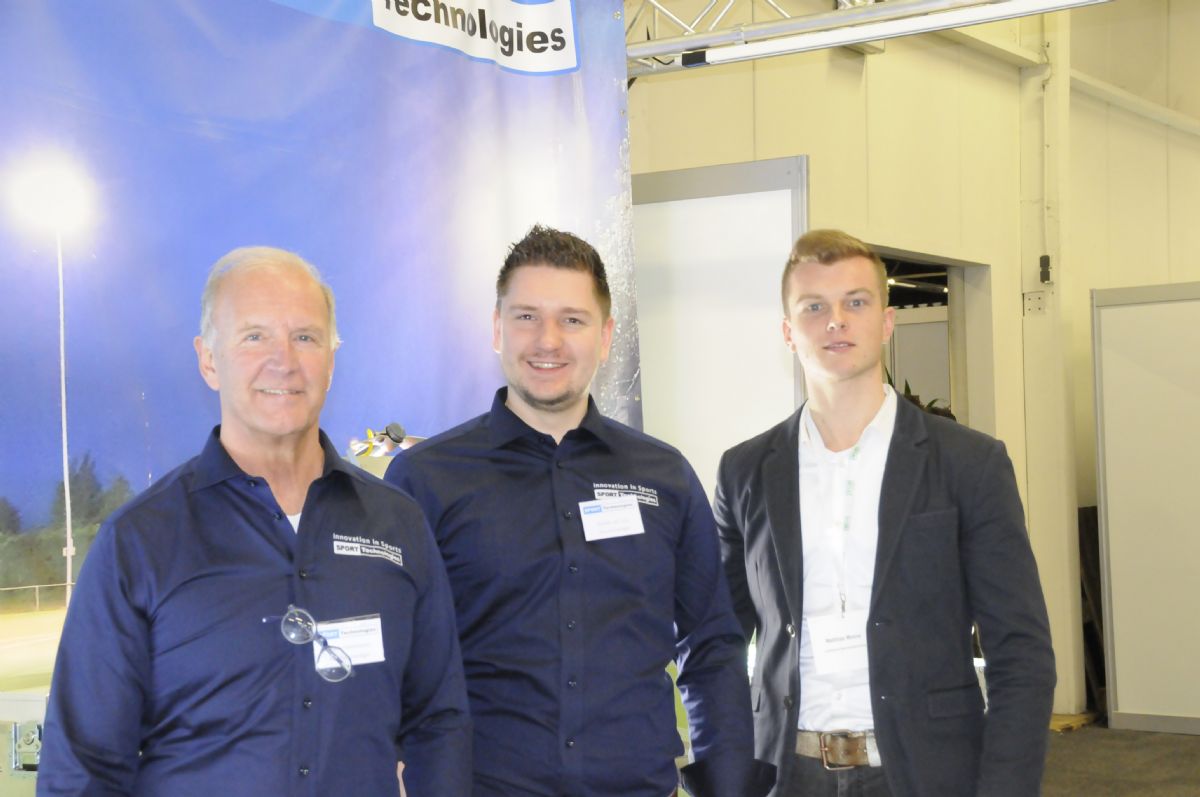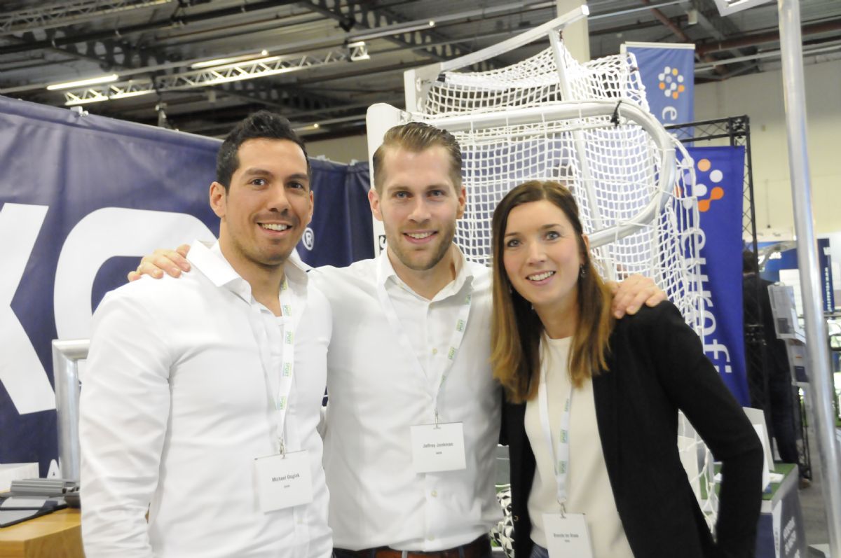 Bas v Oosterhout wil haar bekendheid binnen de sportveldensector vergroten. Peter van Beers en Ronnie van Oosterhout bemanden de stand.
