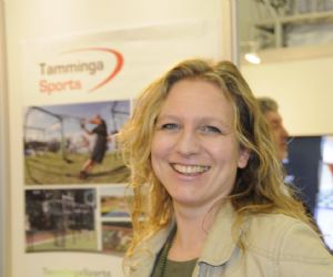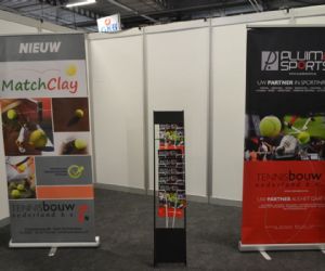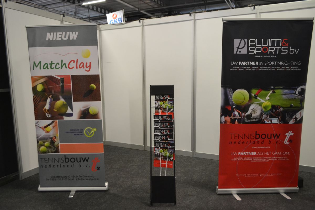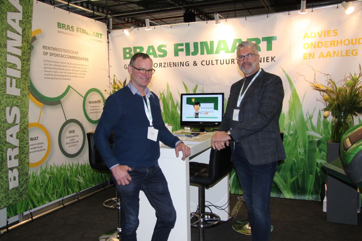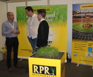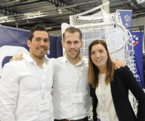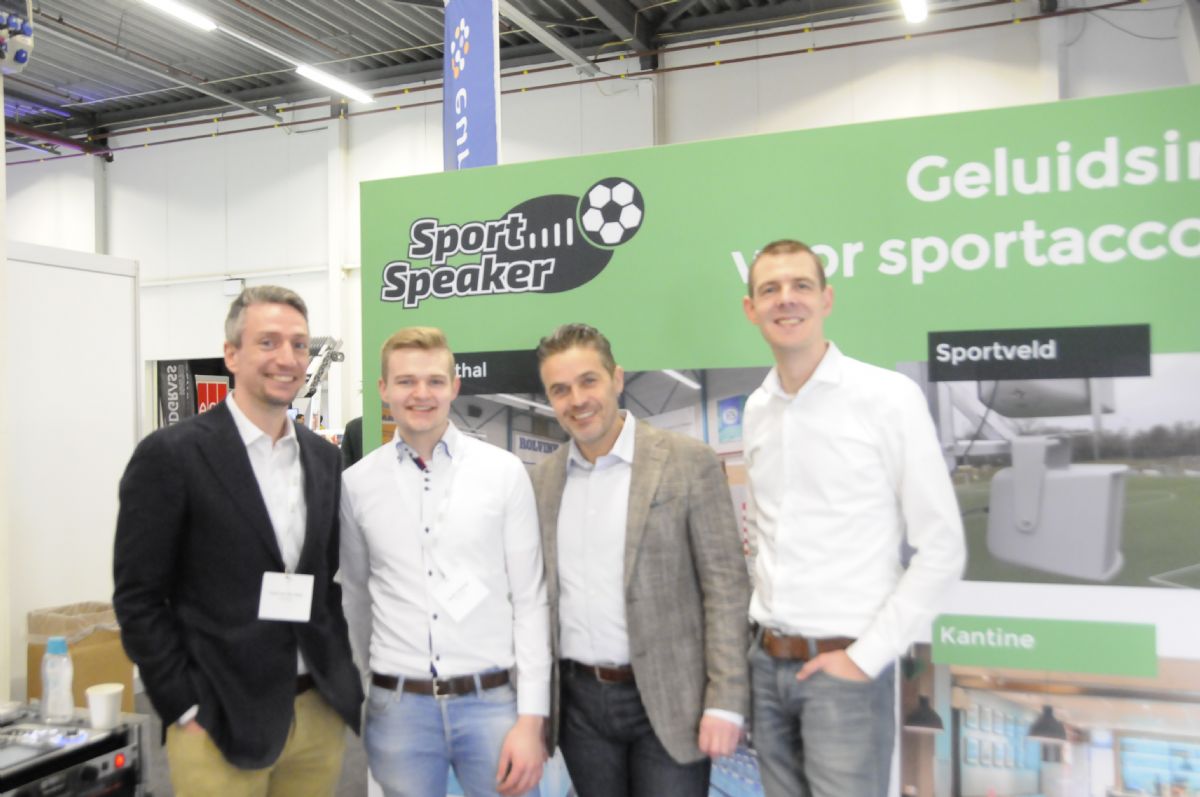 Bas v Oosterhout wil haar bekendheid binnen de sportveldensector vergroten. Peter van Beers en Ronnie van Oosterhout bemanden de stand.