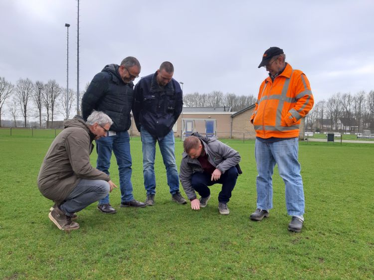 Het gezelschap neemt een kijkje op het veld. Van Tilburg: 'Het weer zit nog steeds niet mee. Er is de afgelopen maanden veel regen gevallen in West-Brabant.' Koolen raadt de gemeente aan goed in de peiling te houden wanneer de wortelontwikkeling begint. 'Ik bedoel niet de kleine witte worteltjes, maar de stevige wortels. Zodra je die ziet, heeft het veld belasting nodig. Daardoor krijgt het stabiliteit.'