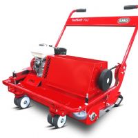 We bekijken het kleinere broertje, waar bedrijven die kunstgrasvelden onderhouden inmiddels al meerdere seizoenen mee werken: de SMG Turfboy TB2. De zelfrijdende machine met een luchtgekoelde 16 pk-benzinemotor bevalt goed: 'Het is een enorm voordeel dat we een kleinere machine hebben. Deze machine heeft een werkbreedte van 90 cm en je zou hem in een grote bus kunnen vervoeren.' Volgens Hak werken verschillende Nederlandse aannemers hiermee: 'Van maart tot en met oktober en minimaal vijf à zes uur per dag. Tijdens het groot onderhoud viel hen op hoe weinig slijtage de machine vertoonde aan de V-snaren en de rest van de aandrijving.' De roterende borstel verwijdert de bovenste laag van de infill. De diepte hiervan is verstelbaar. Een zeef en een filter scheiden het vuil van de infill. De trilbodem van de zeef kan nauwkeurig worden afgesteld, qua deeltjesgrootte variërend van 4 tot 10 mm. Het vuil wordt opgevangen in een sleeplade. Het gereinigde infill-materiaal wordt doorgevoerd in de machine en een filter haalt het fijnere stof eruit. Hak: 'Bij deze machine moet je de sleeplade handmatig leegmaken. Deze lade is licht en handzaam gemaakt. Het filter kun je schoonkloppen met een draaiknop, die een rubberen lamel langs het grote permanente filter laat gaan. Ook achter deze Turfboy kun je verschillende accessoires aankoppelen, zoals een borstelframe dat het infill-materiaal met zachte bewegingen terugbrengt in het kunstgras.' Een frame waaraan je accessoires als een kriebel-eg, borstelbalk of magneetbalk bevestigt, kan door de bestuurder vanuit de bestuurderspositie opgetild worden, net als bij een zitmaaier, dus. Dit maakt het gemakkelijk om de randen en hoeken van de velden te bereiken. Met de Turfboy kun je dus zowel decompacteren, de toplaag reinigen, slepen, vegen en mos en algen loskrabbelen en verwijderen, zonder dat je in een minitractor hoeft te investeren.