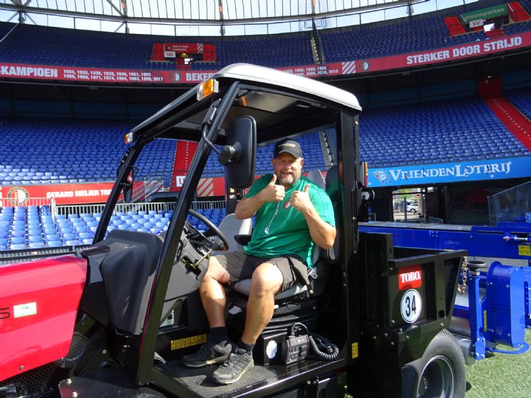 Het Feyenoord-stadion De Kuip kreeg vorig jaar voor de zesde keer op rij de prijs voor het beste veld van de eredivisie. De schaal, uitgereikt door de Vereniging van Contractspelers (VVCS), is een pluim op de hoed van grasmeester Erwin Beltman. En van zijn machinepark, waaronder de gloednieuwe Toro Outcross.