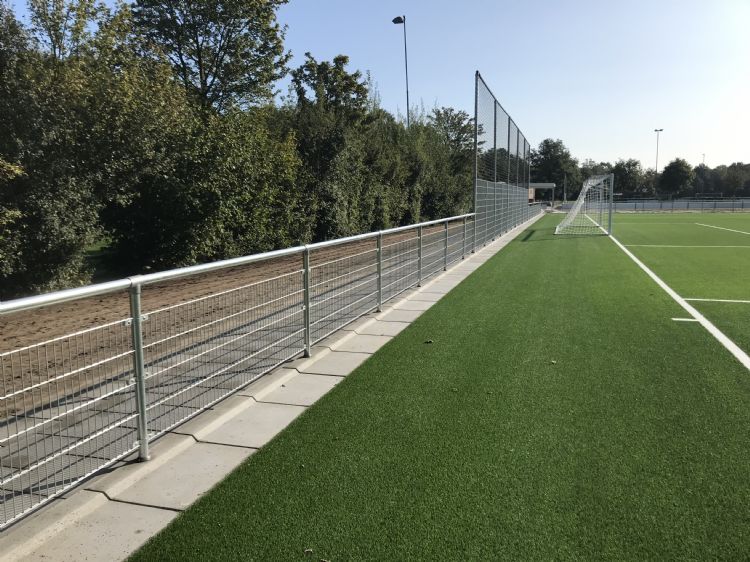 Veerkamp: 'In de betonplaten voor één van die zeven velden hebben we fabrieksmatig ronde sparingen gemaakt voor hekwerkbuizen. De plaatafmetingen en de ronde gaten waren nauwkeurig afgestemd op de afmetingen van de staafmat. Hierdoor hoefde er niet meer op locatie geboord te worden. Het is onhandig en onnodig om speciaal iemand met een boormachine naar de bouw te laten komen om deze gaten te boren. Wij kunnen eenvoudig maatwerk leveren vanuit de fabriek. Dan is het wel belangrijk dat het adviesbureau de vereniging op tijd bij de planvorming betrekt, zodat de hekwerkleverancier niet op het laatste moment van de vereniging hoort dat die de hekken liever iets verderop wil.'
