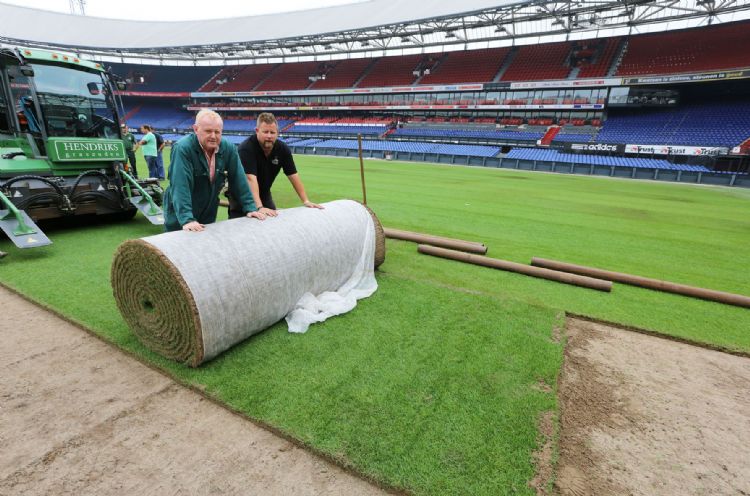 | Archieffoto uit 2014. John Hendriks legt met Erwin Beltman graszoden in De Kuip. |