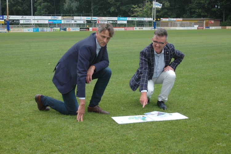 | De gemeente Zwijndrecht verstrekte aannemer Dick Nootenboom (links) een aantal geplastificeerde brochures met alle ins en outs van de sportvelden. |