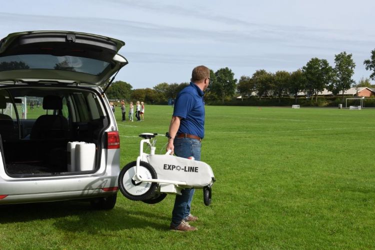 Al sinds 2002 plaatst Expoline tankunits met een hoogte van 2 m en een diameter van 95 cm bij verenigingen. Ze hebben een inhoud van 540 l met kant-en-klare belijningsverf en worden vier tot vijf keer per jaar opnieuw gevuld. Sinds 2008 verkoopt het bedrijf ook voetbalmaterialen, en in 2012 startte Expoline met een statiegeldsysteem voor de jerrycans met kant-en-klare belijningsverf. Sinds vorig jaar maakt Expoline samen met transportbedrijf FedTrans distributieritten met grote citytrailers met een inhoud van 10.000 liter. Er kunnen zo'n 25 klanten per rit bediend worden; zo brengt het bedrijf het aantal transportbewegingen dus terug. Het laatste nieuws brengt CEO Raf Bogaerts in juni 2020: 'We zijn bezig om een speciale verf te ontwikkelen voor onze belijningsrobot Robot Line Maker, die we samen met Tiny Mobile Robots, premarking-specialist voor wegen, hebben ontwikkeld. De Robot Line Maker heeft de innovatieprijs gewonnen op de Paysalia-beurs in Lyon. Deze robot wordt bestuurd met een tablet en gebruikt acht referentiepunten (de vier hoeken van het veld en de doelpalen) om een veld automatisch te kunnen belijnen. De robot berekent met behulp van gps de grootte van het veld en waar de lijnen moeten komen. Binnen een half uur is het veld belijnd; dat scheelt enorm veel tijd. Als je het op de traditionele manier doet, ben je een paar uur kwijt.' Dit najaar komt Bogaerts naar buiten met meer nieuws over de nieuwe robotbelijningsverf.