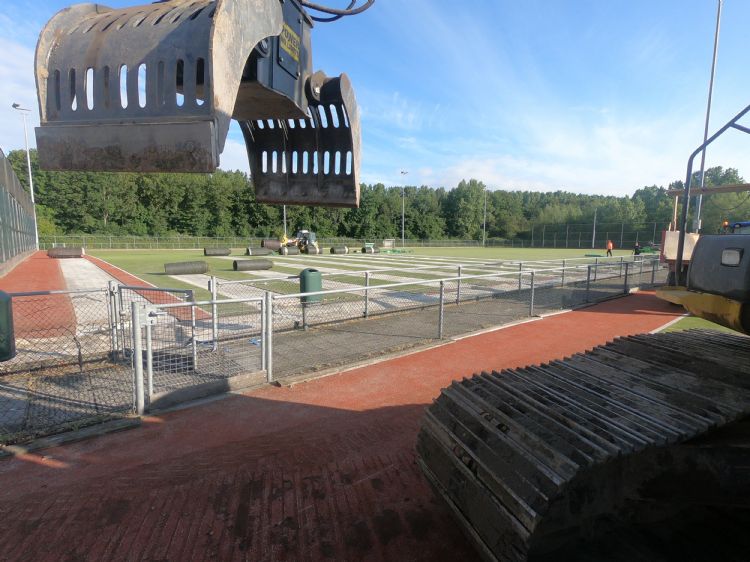 De renovatie van de velden 2 en 3 begon met het verwijderen van de toplaag. Zo kon eerst de asfaltlaag onder de beide velden worden schoongemaakt. Vervolgens werd in de asfaltlaag ruimte gemaakt voor de plaatsing van een klemgoot, die beide velden stabiel op hun plaats houdt.