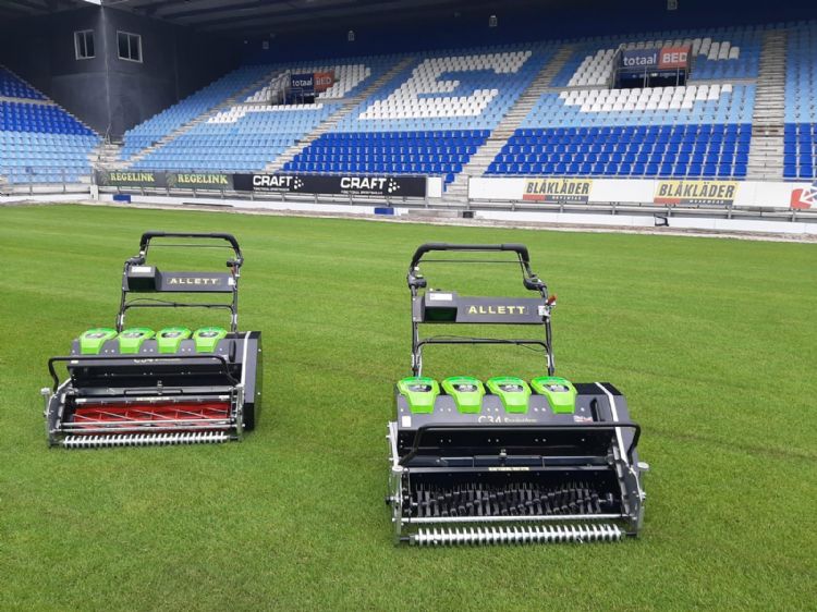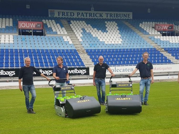 Afgelopen week zijn bij PEC Zwolle twee Allett C34 Evolution met 8 blads cassette en turf rake cassettes afgeleverd door dealer Hofstede-Timmerman. Ook Allett-importeur Milati Grass Machines was bij de levering aanwezig. PEC is één van de eerste Nederlandse clubs die met de C34E gaat maaien.