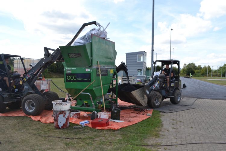 Uiteindelijk begon GCC in juli met de baanrenovatie. De eerste stap van het project is natuurlijk hetzelfde als normaal: het afhalen van de oude toplaag. Deze tartan lag er al sinds 2006 en was hard aan vervanging toe. Het verschil is dat deze toplaag niet wordt afgevoerd, maar de 25 ton materiaal ter plaatse wordt gerecycled. GCC heeft zelf een mobiele machine ontwikkeld om dit op locatie te kunnen doen. Het was nog even spannend of men erin zou slagen de machine deze zomer al in te zetten - een belangrijk onderdeel moest uit China komen - maar uiteindelijk is het gelukt. Steffelaar wil niet prijsgeven hoe de machine in elkaar zit: dat is het geheim van de smid. De machine is ook niet op locatie aanwezig, omdat de concurrentie het idee dan zo kan overnemen. Steffelaar: 'Aan de ene kant van de machine gaat het rubber van de oude toplaag erin, en aan de andere kant komt het er als bouwstof uit. Aan die bouwstof voegen we een bepaald percentage polyurethaan toe, dat iets afwijkt van het normale percentage. Met die combinatie bouwen we de nieuwe toplaag weer op.'