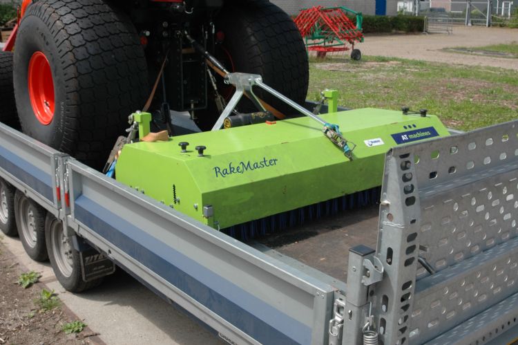 In de driepuntshef van de tractor die op de aanhanger staat, is een Rakemaster aangekoppeld. Hiermee heeft Van Elsloo deze dag een aantal velden behandeld om het compacteren van de infill tegen te gaan. De kunstgrasvezels zijn weer rechtop gezet; daarna heeft de machine met de borstels de infill weer geëgaliseerd. 'Deze machine kunnen we inzetten op meerdere types kunstgras. Met een slim, roterend systeem kunnen we de pennen en borstels van deze machine wisselen. De diepte-instelling van de slepende pennen laat zich gemakkelijk regelen met een ringsleutel.' Het blijkt dat deze Rakemaster met een werkbreedte van 180 cm niet het enige werktuig is waarmee ze de kunstgrasvelden met infill fris en fruitig houden. In de loods staat ook een Rolugro en een Bristoly Power 3.2 wiedeg-borstelcombinatie. 'We werken nu voor het derde seizoen met dit multifunctionele werktuig', licht Postma toe. 'Met een snelwisselsysteem vervang je de wiedeg bijvoorbeeld door een groene driehoeksborstel. Dan kunnen we ermee terecht op onze zandinfill-velden en ons ene waterveld. Met 320 cm breedte kun je mooi meters maken.' Postma toont ook de blauwe driehoeksborstel met de stugge draden van 3 mm voor de oppervlakkige bewerking van SBR-velden, en de gele driehoekborstel met 2,2 mm lange draden. 'Dit is de maximale dikte waarmee we op de EPDM-velden mogen komen. De werking hiervan is minder agressief; we gebruiken hem altijd in combinatie met onze Shibaura. Op deze tractor monteren we in de herfst overigens altijd een kleinere bladblazer.'