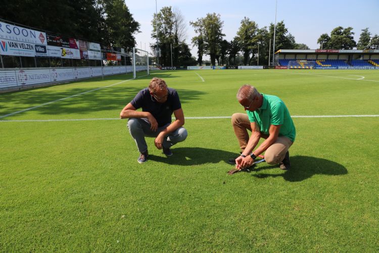 | | Fred Hoek (links) en Hans Vervaart inspecteren het wortelstelsel van het gras op het hoofdveld van FC Lisse. |
